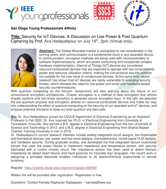 - Hedayatipour held a talk for IEEE SSCS YP on Security for IoT Devices (Summer 2023).