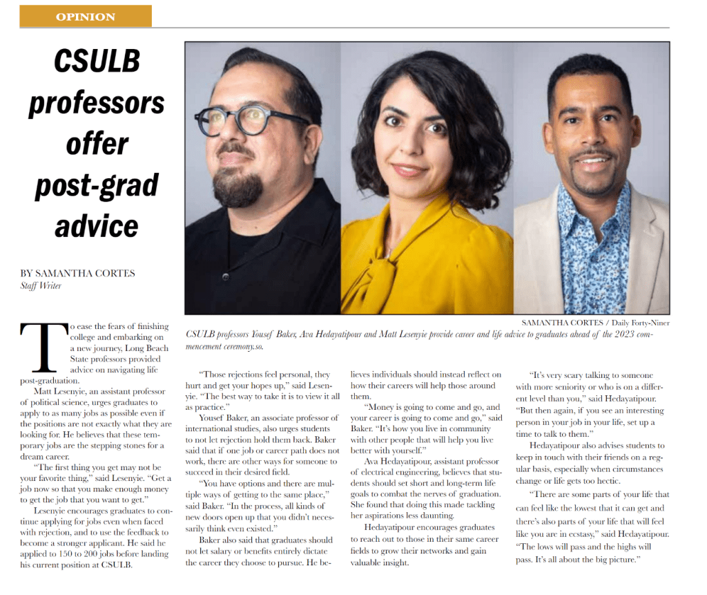 - Hedayatipour interview on Post-Grad advice was featured in CSULB Daily Forty-Niner (Spring 2023).