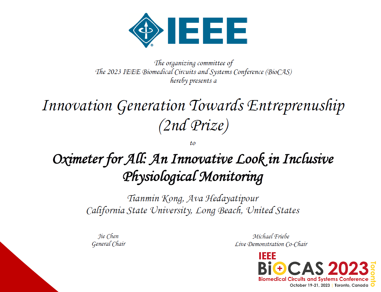 - The paper by T. Kong, A. Hedayatipour, “Oximeter for all: An innovative look in inclusive physiological monitoring”, was awarded 2nd place winner among 30 teams in the IEEE BIOCAS 2023 innovation challenge.